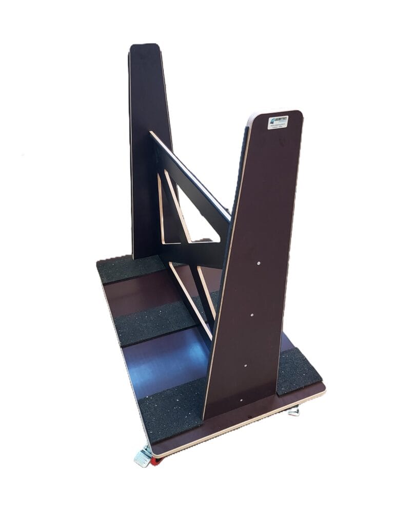 Vanerista rakennettu lasinkuljetuspukki pyörillä tyhjänä